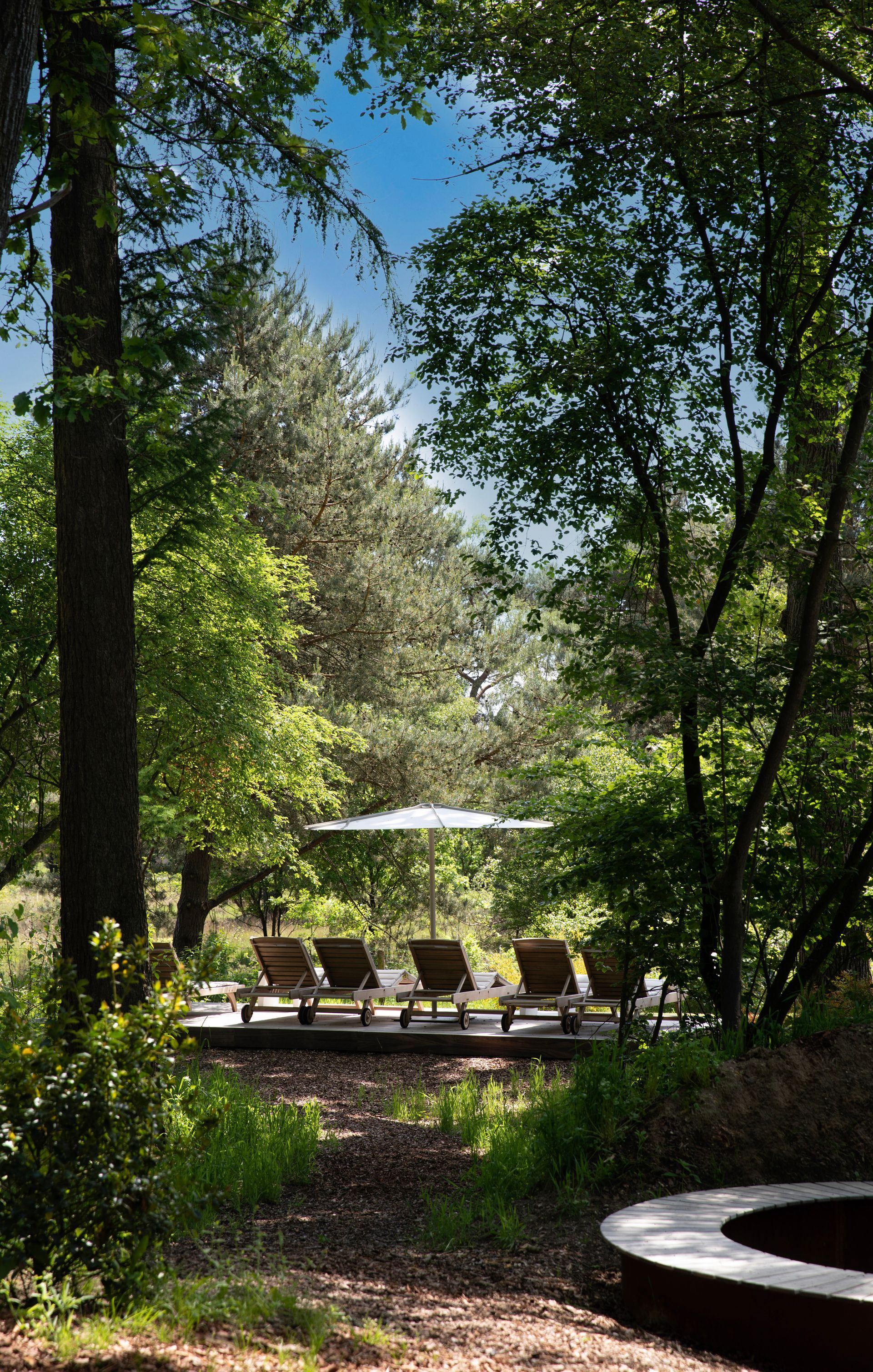 Vlak naast de whirlpool bevinden zich in de tuin luxe ligbedden, waar u in alle rust kunt ontspannen en genieten van het prachtige uitzicht op de Stakenbergse Heide. Een heerlijke plek om na te genieten en helemaal tot rust te komen.