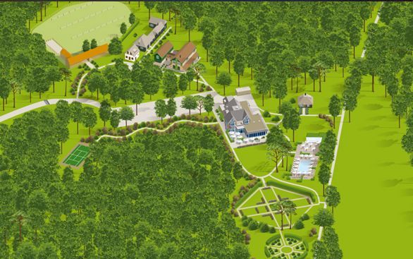 Nadat u op de 1 kilometerlange oprijlaan het wildrooster gepasseerd bent, ziet u de karakteristieke villa liggen. Via de zoetgeurende rozentuin loopt u langs het verwarmde buitenzwembad en via het Poolse huis naar het Koetshuis, Voorhuis, Manegehuis en tenslotte de paardenstallen. Verscholen tussen de rododendrons ligt de tennisbaan.